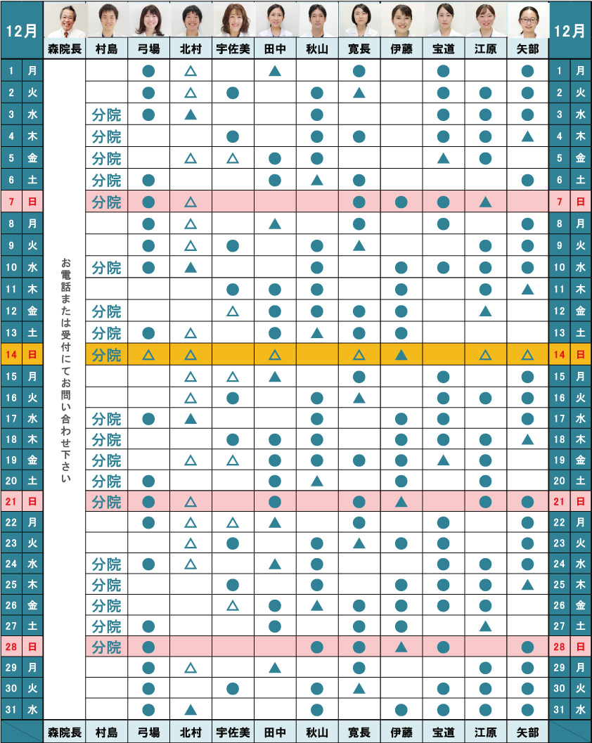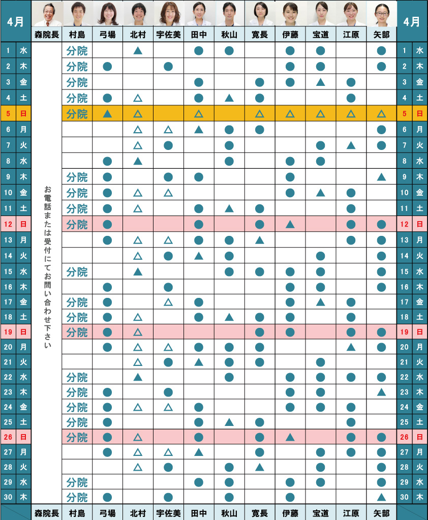 ※ 無印の日は休み、もしくは院内にはおりますが、手術・入院担当日で外来の診察はいたしません、ご了承下さい。